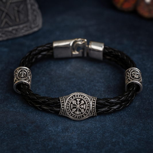 Viking Leather Bracelet – Wide Braided Cuff with Vegvisir Rune