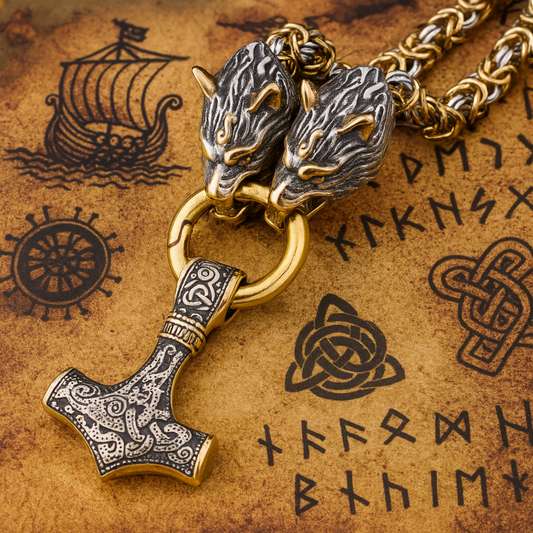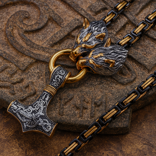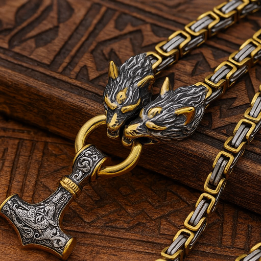 Wolf Heads & Thor’s Hammer Viking Necklace – Norse Emperor Chain