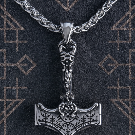 Thor’s Hammer Necklace – Stainless Steel Mjolnir with Vegvisir Rune