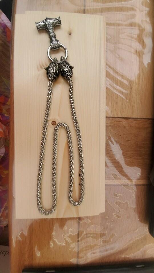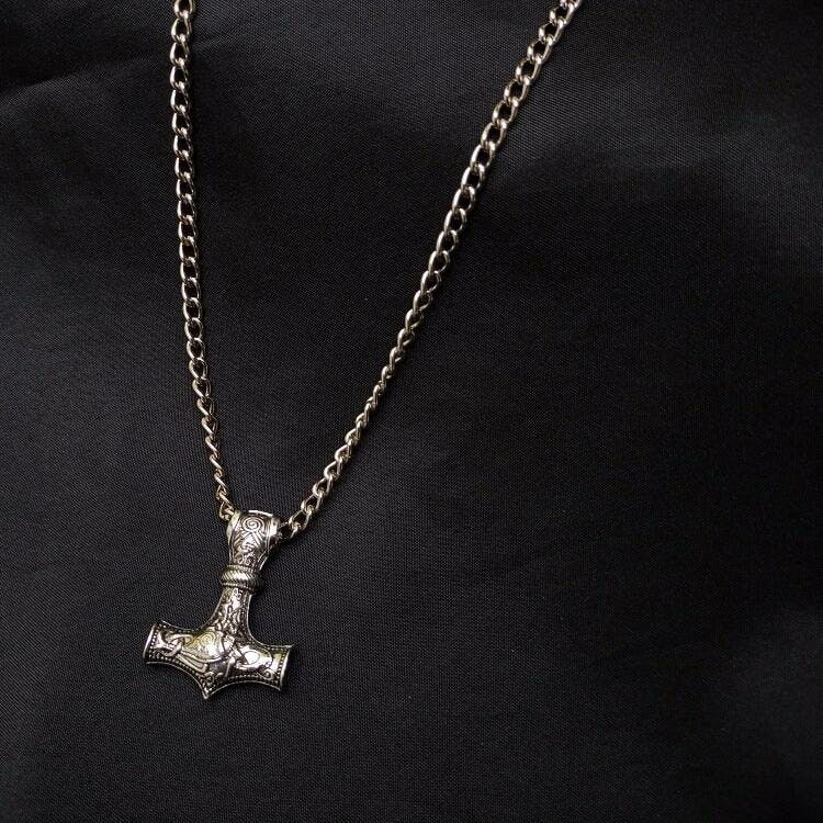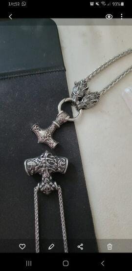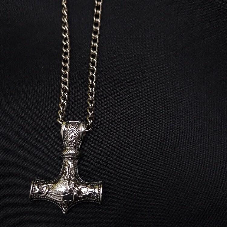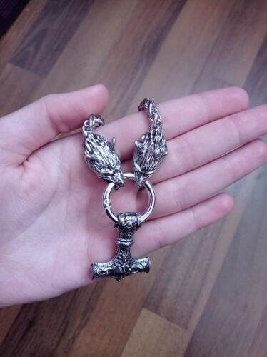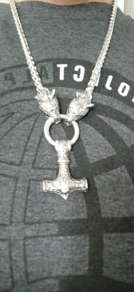 Embody the spirit of a fearsome Viking warrior by wearing this stainless steel heavy Viking chain necklace that weighs 5.29oz (150g). The necklace will serve as your protector! Available in 3 sizes: 20, 24 or 28". The neckless clasps two wolves heads; a heavy pendant consists of one of the best-known items from the Viking Age: the Thor's Hammer (Mjölnir in Old Norse), hangs on a stainless steel loop and kings chain painstakingly handmade loop by a noose with a clasp at the back.